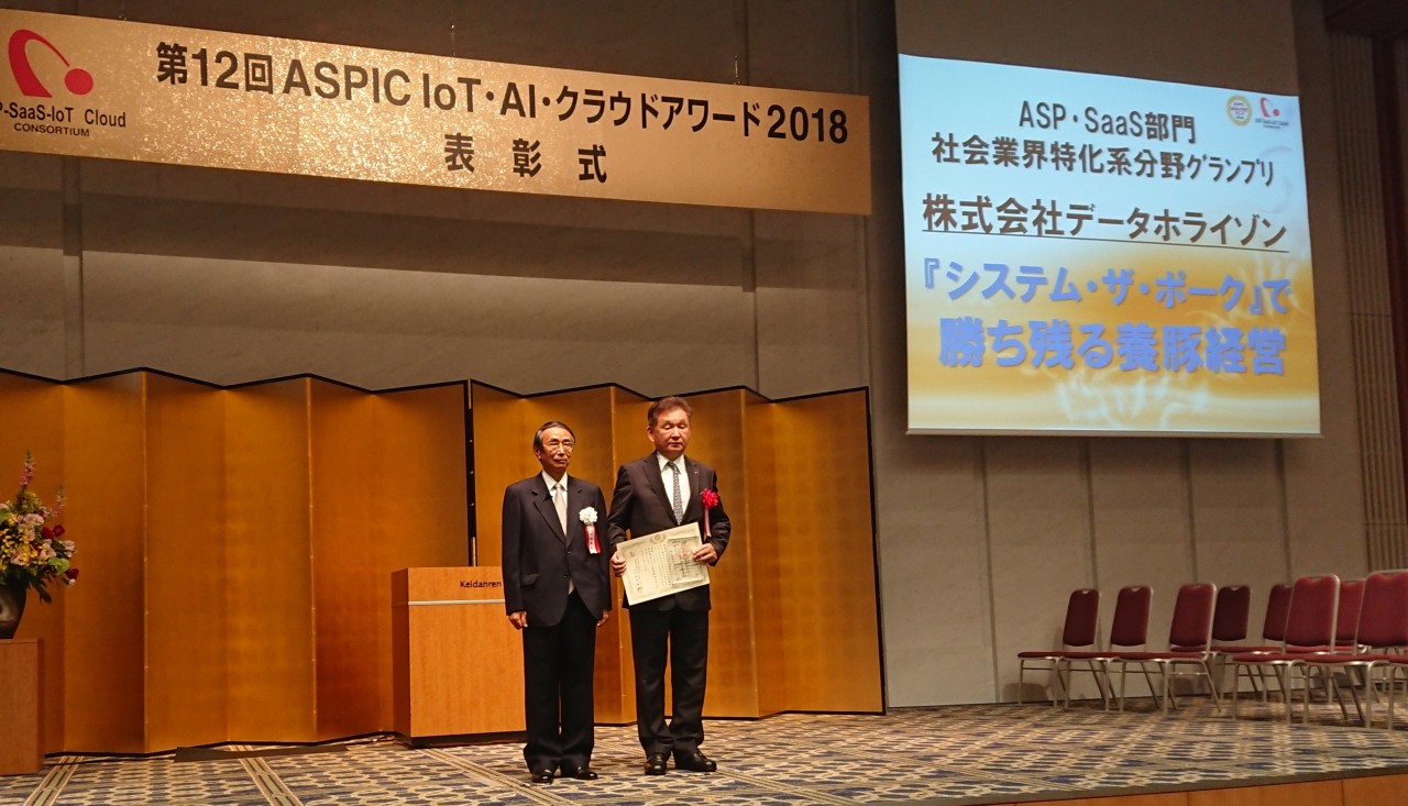 を受賞しました。 - 特定非営利活動法人ASP・SaaS・IoT クラウド コンソーシアムが主催する「ASPIC IoT・クラウドアワード2018」の社会・業界特化系分野で、「『システム・ザ・ポーク』で勝ち残る養豚経営」が「社会業界特化系分野準グランプリ」を受賞し、表彰されました。